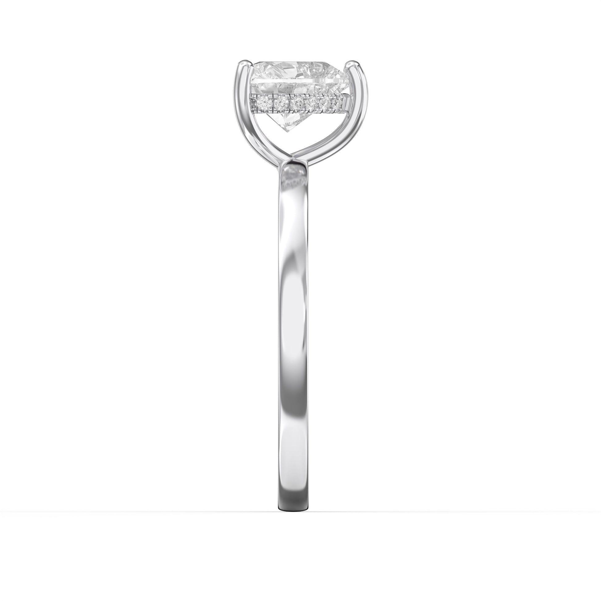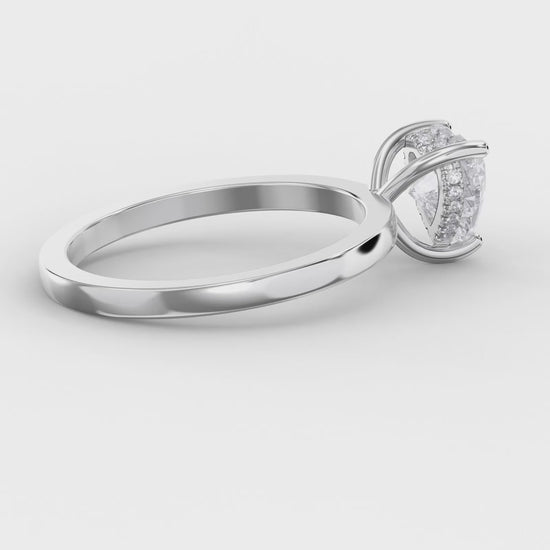 The Amour Whisper Heart Hidden Halo Ring showcases refined elegance through its distinctive design, featuring a concealed halo that frames the center stone with subtle sophistication.