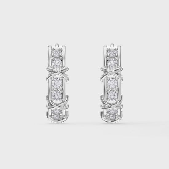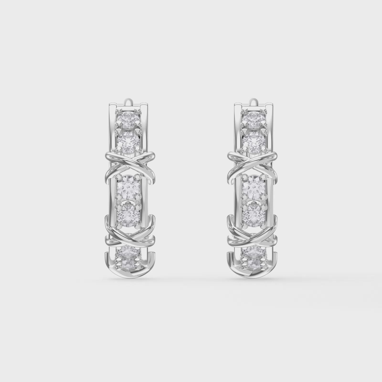 Discover architectural elegance with these diamond hoops, defined by intricate crisscross detailing that creates dynamic dimension and movement. Each interlocking pattern is set with brilliant diamonds, showcasing masterful craftsmanship and precision engineering. The geometric design adds modern sophistication while maintaining timeless appeal, making these hoops a statement piece for the discerning collector. Versatile enough for daily wear yet striking enough to command attention at any occasion.