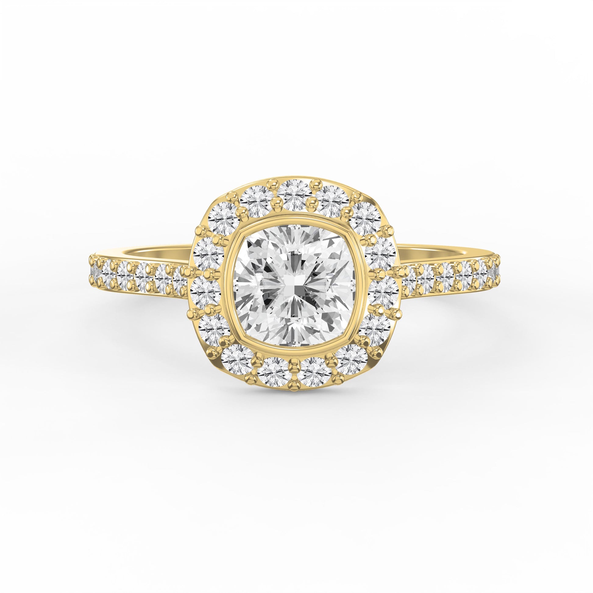The stunning cushion-shaped center stone is beautifully complemented by brilliant round side stones that amplify sparkle and elegance.