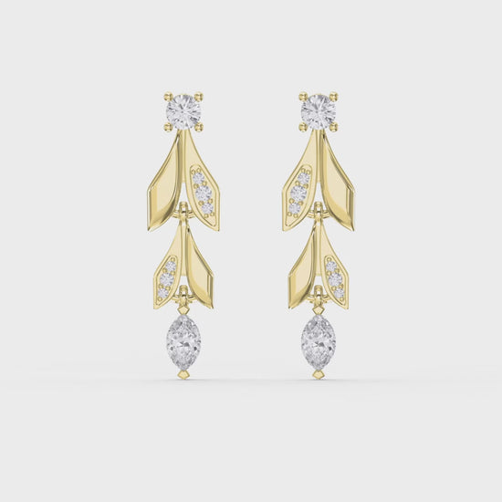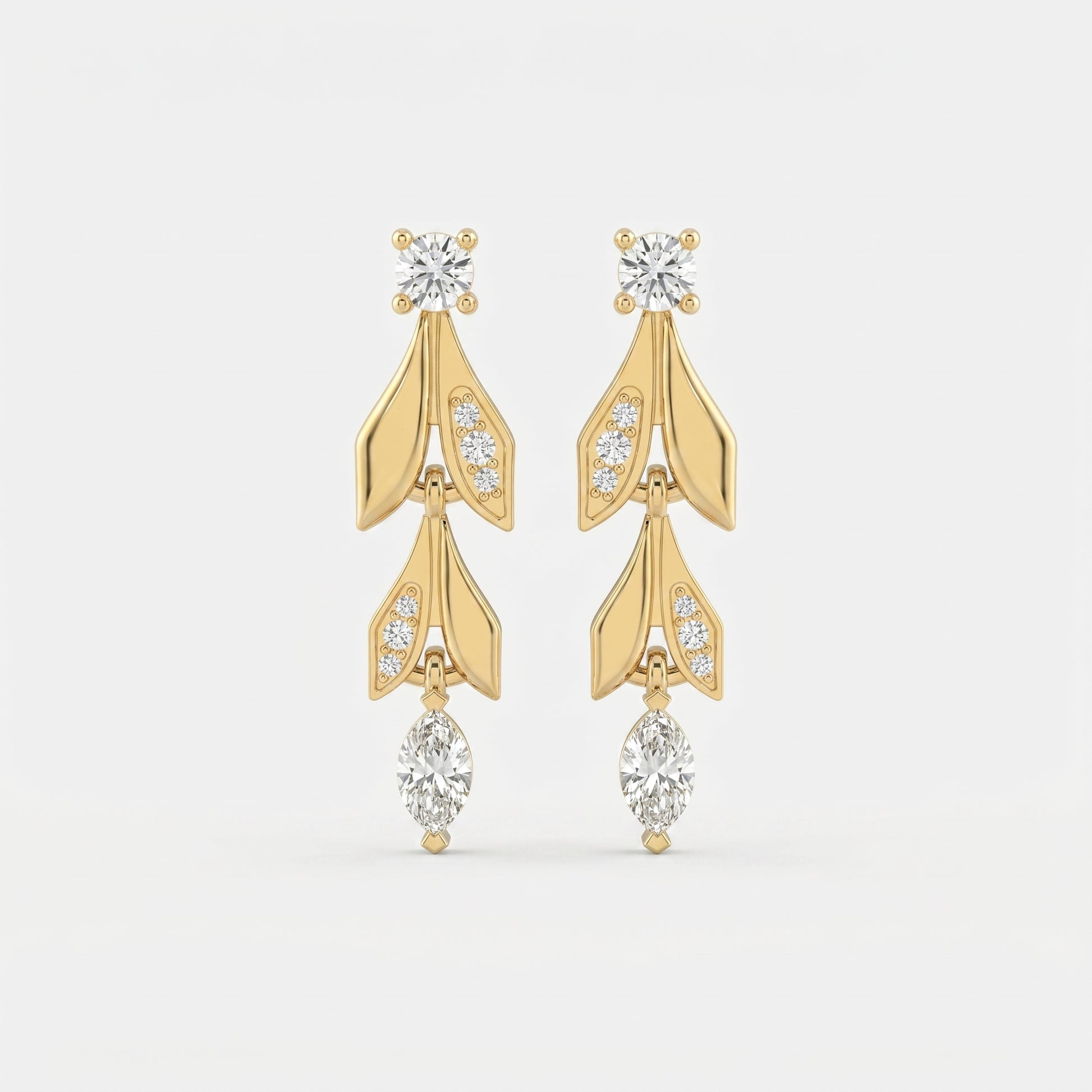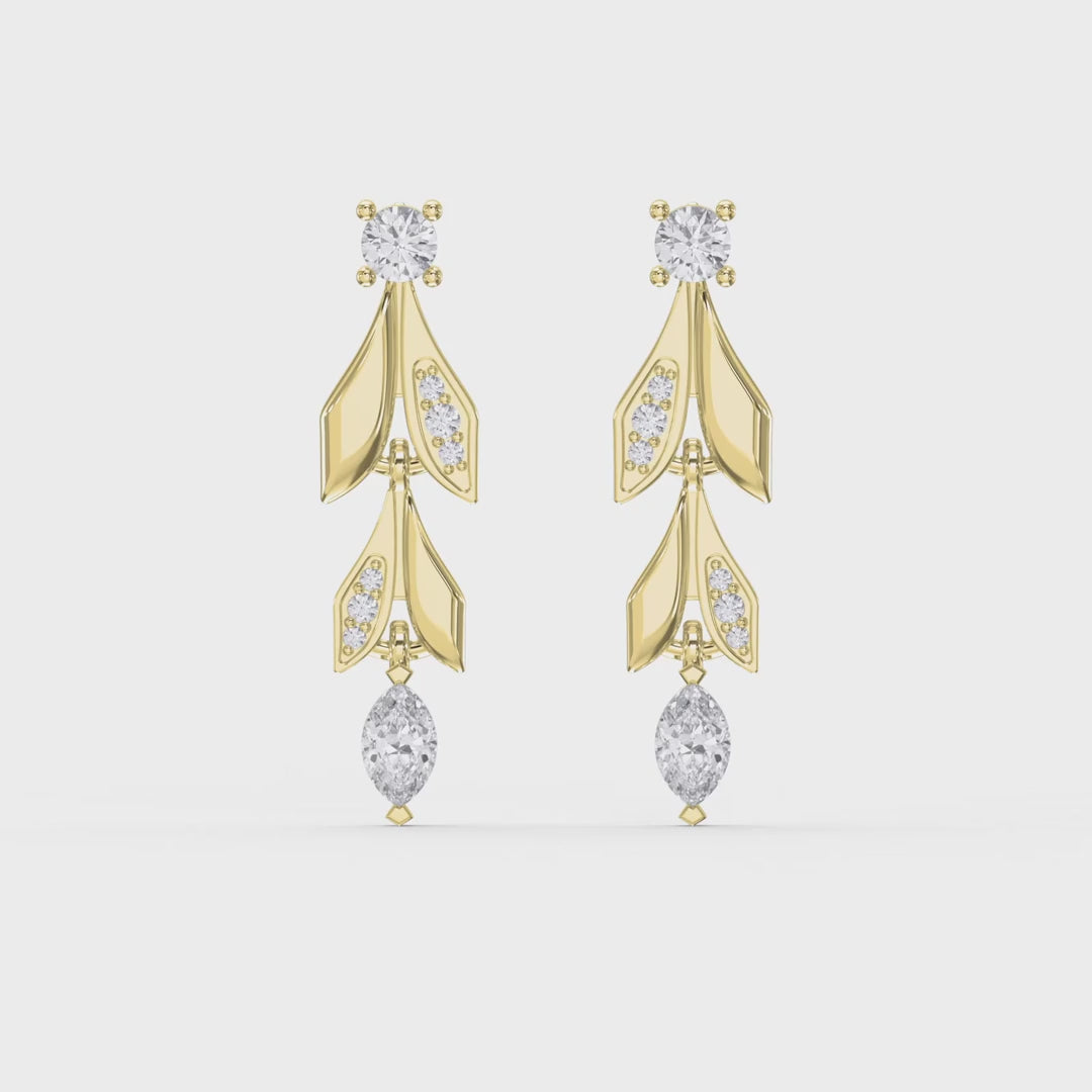 Grace meets luxury in these Elegant Diamond Leaf Drop Earrings by Valam Design Inspired by the beauty of nature, these earrings feature a delicate leaf motif adorned with shimmering round diamonds, gracefully cascading into a dazzling marquise-cut diamond drop.