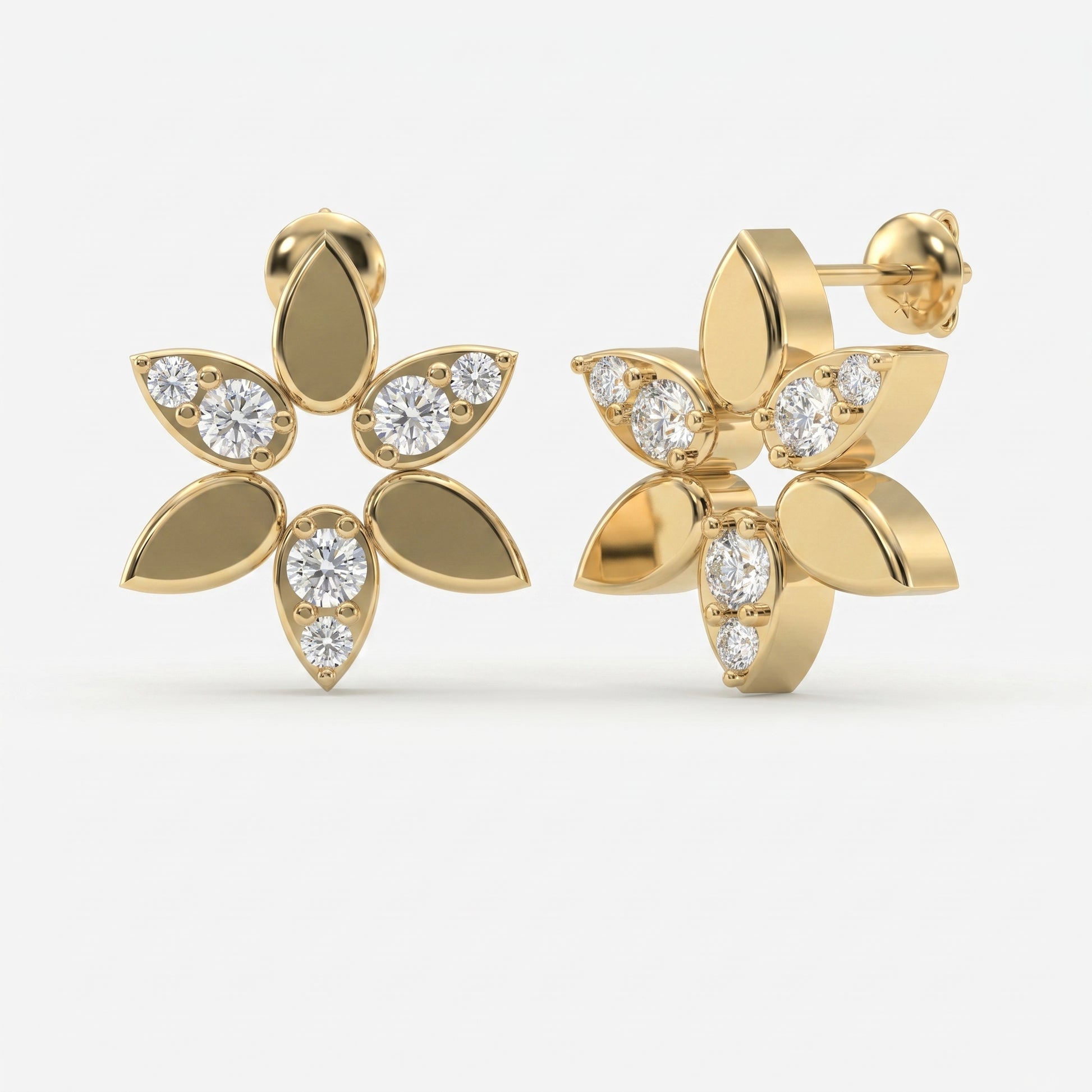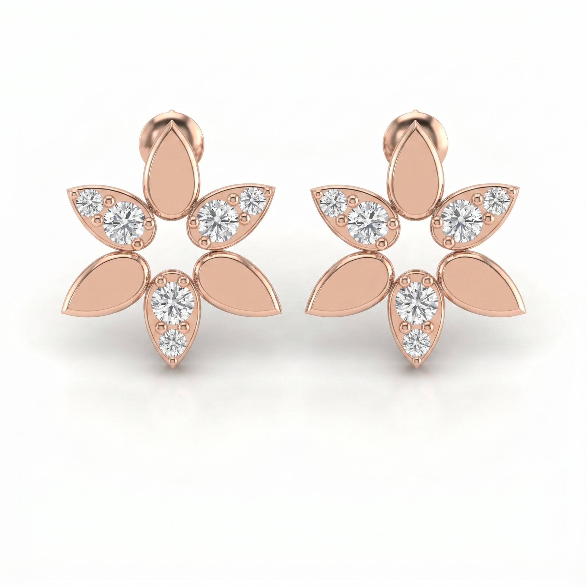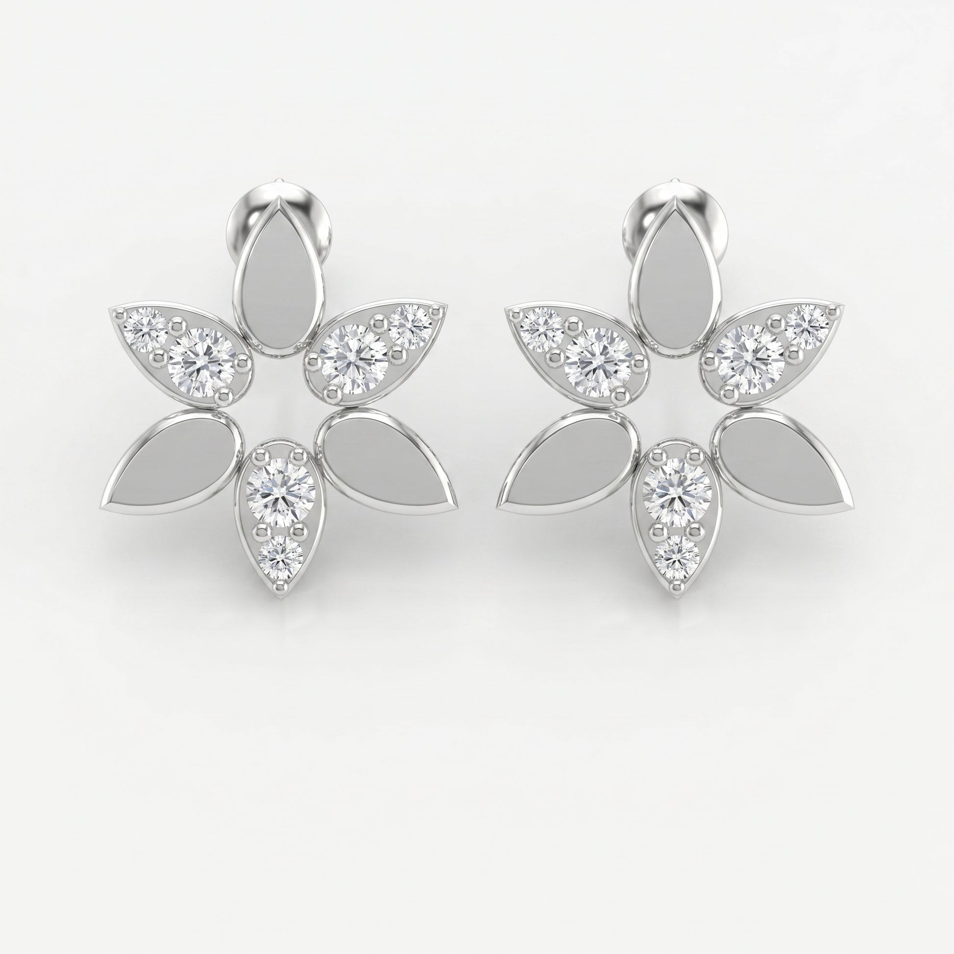 The design features sparkling round diamonds arranged in graceful leaf-shaped petals, creating a radiant floral cluster that reflects light beautifully. The open petal elements combined with brilliant diamonds add dimension and sophistication to the overall look.