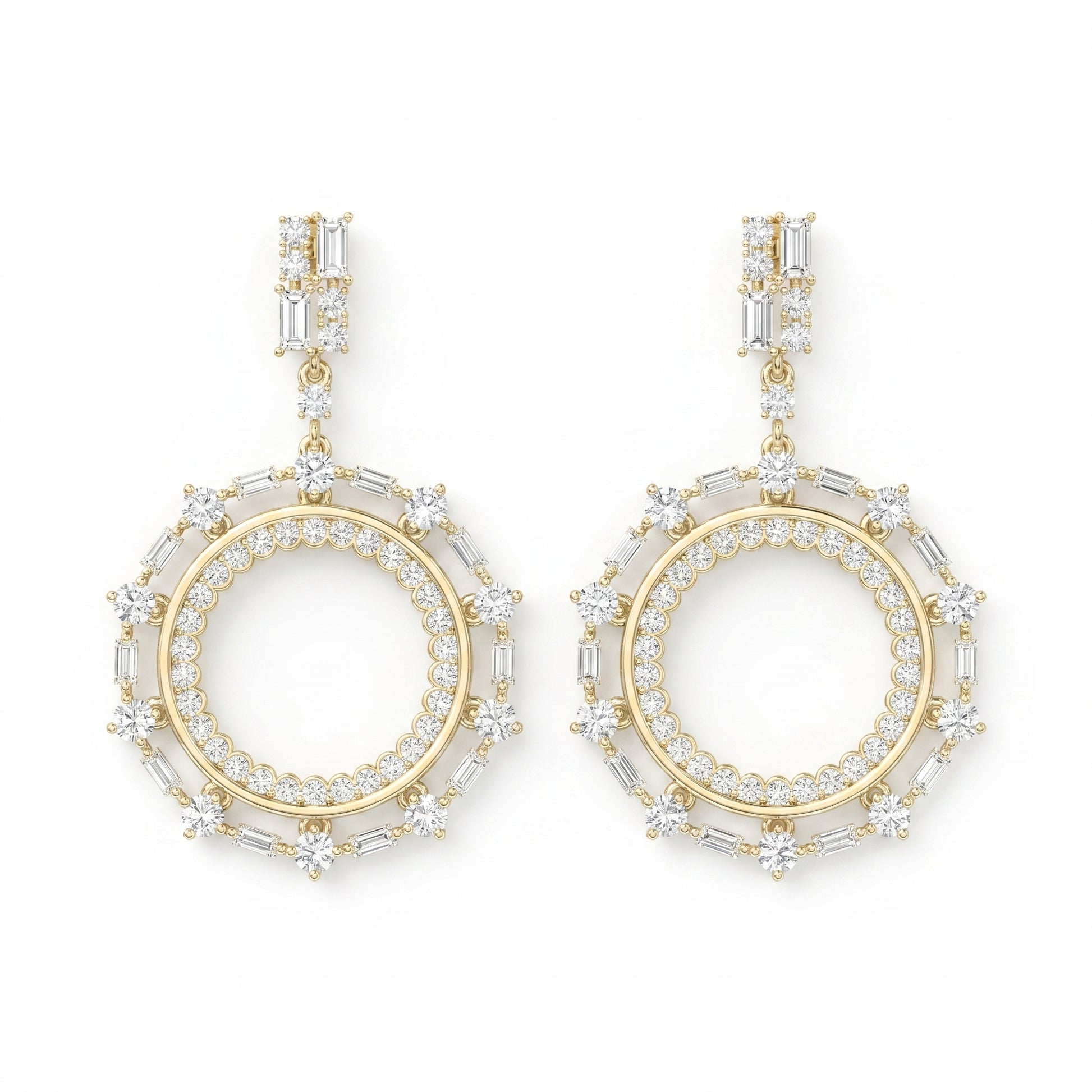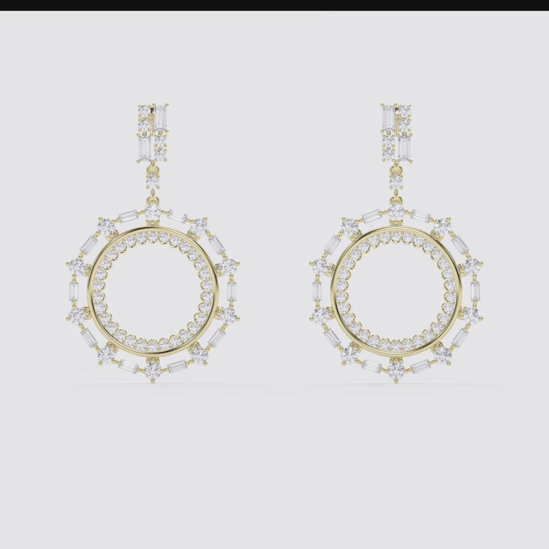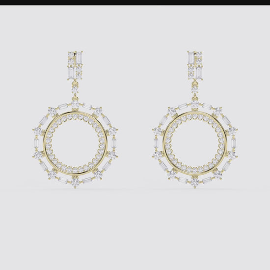 Make an unforgettable entrance with these breathtaking diamond drop earrings, designed to capture light from every angle. Featuring a striking open-circle silhouette, each piece is adorned with a radiant combination of round and baguette-cut diamonds, creating a bold yet refined statement.
