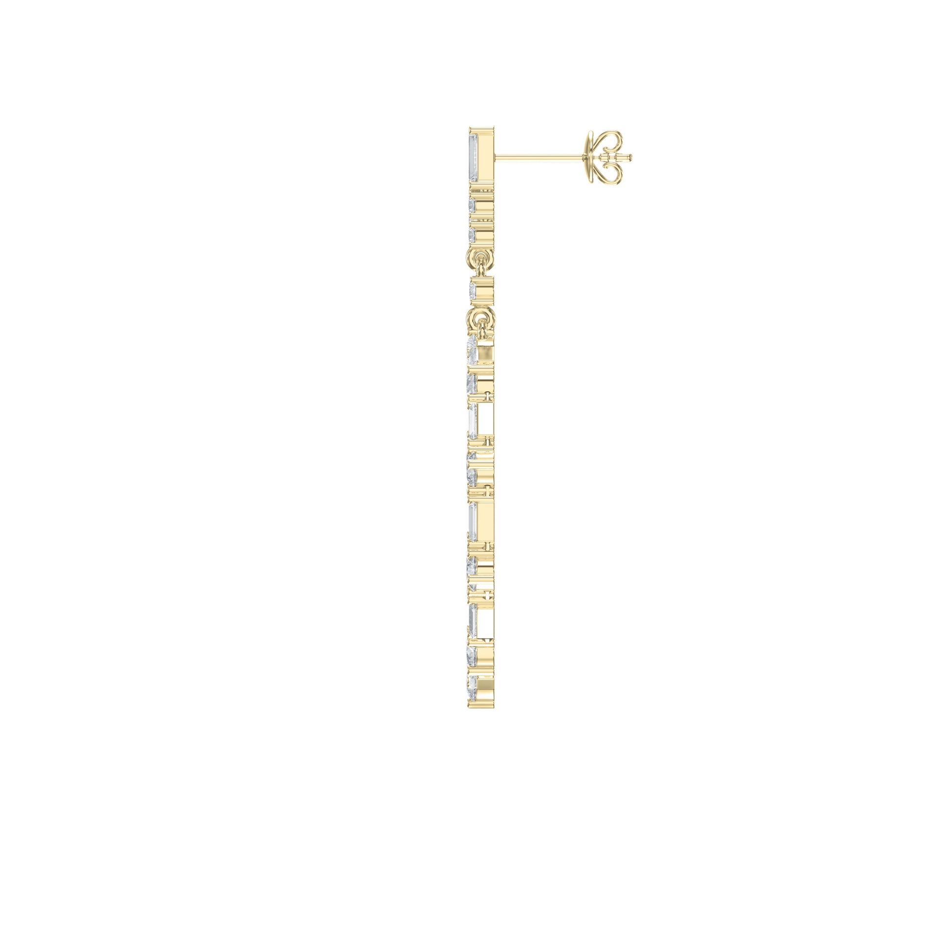 The inner pavé halo adds a soft shimmer, while the outer geometric arrangement delivers brilliance and structure reminiscent of Art Deco elegance. Suspended from a diamond-set top, these earrings move gracefully with every step—offering both fluidity and sparkle.