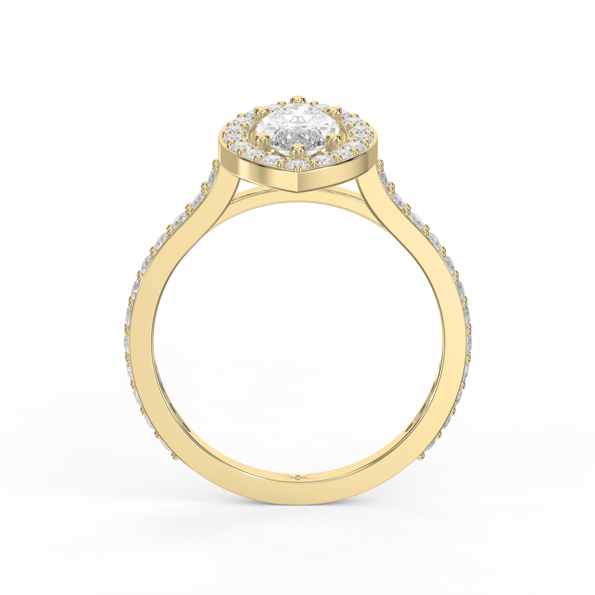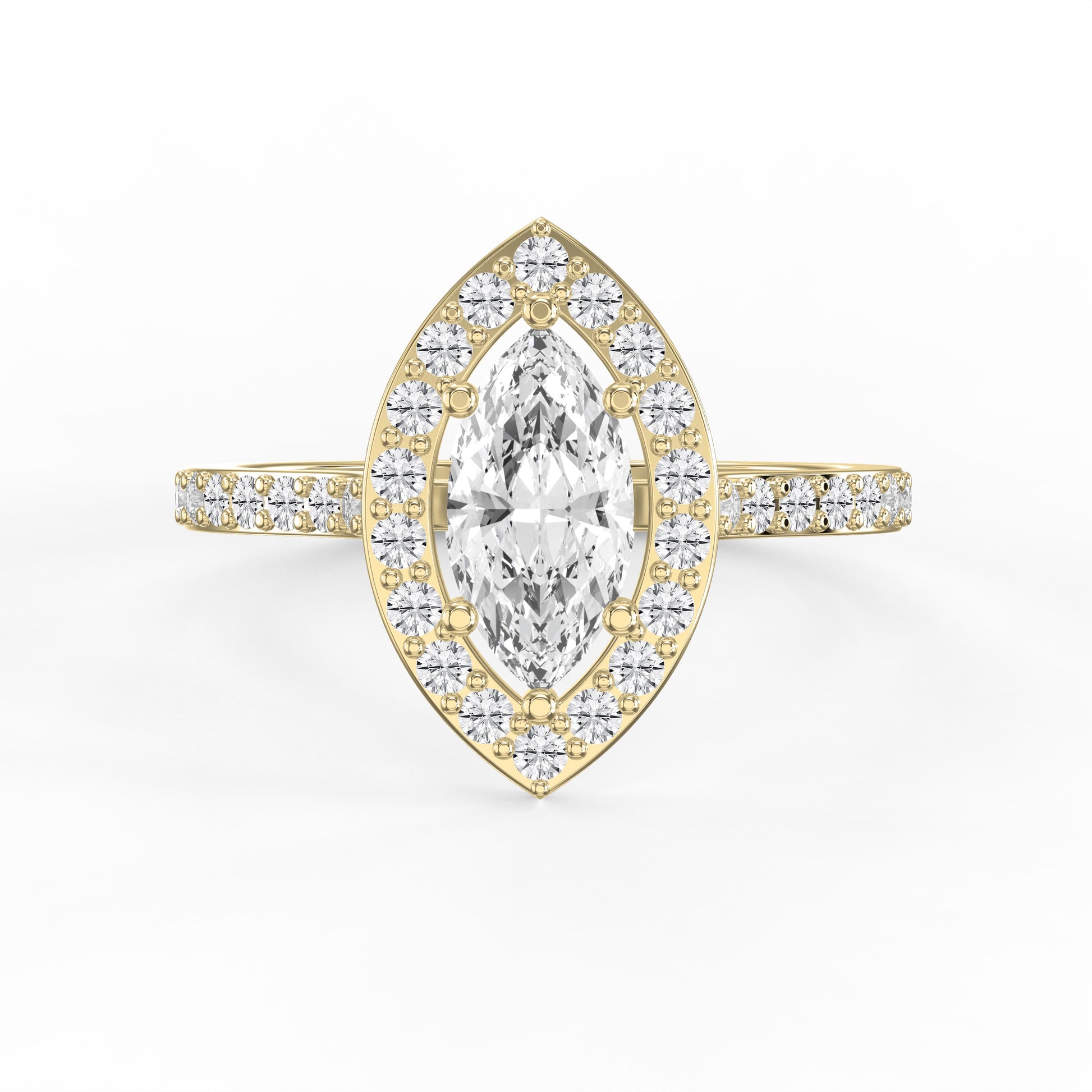 Elegance meets brilliance in this stunning marquise cut diamond halo engagement ring, designed to make a lasting impression. The centerpiece features a striking marquise-shaped diamond, known for its elongated silhouette that enhances finger length and creates a graceful, sophisticated look.