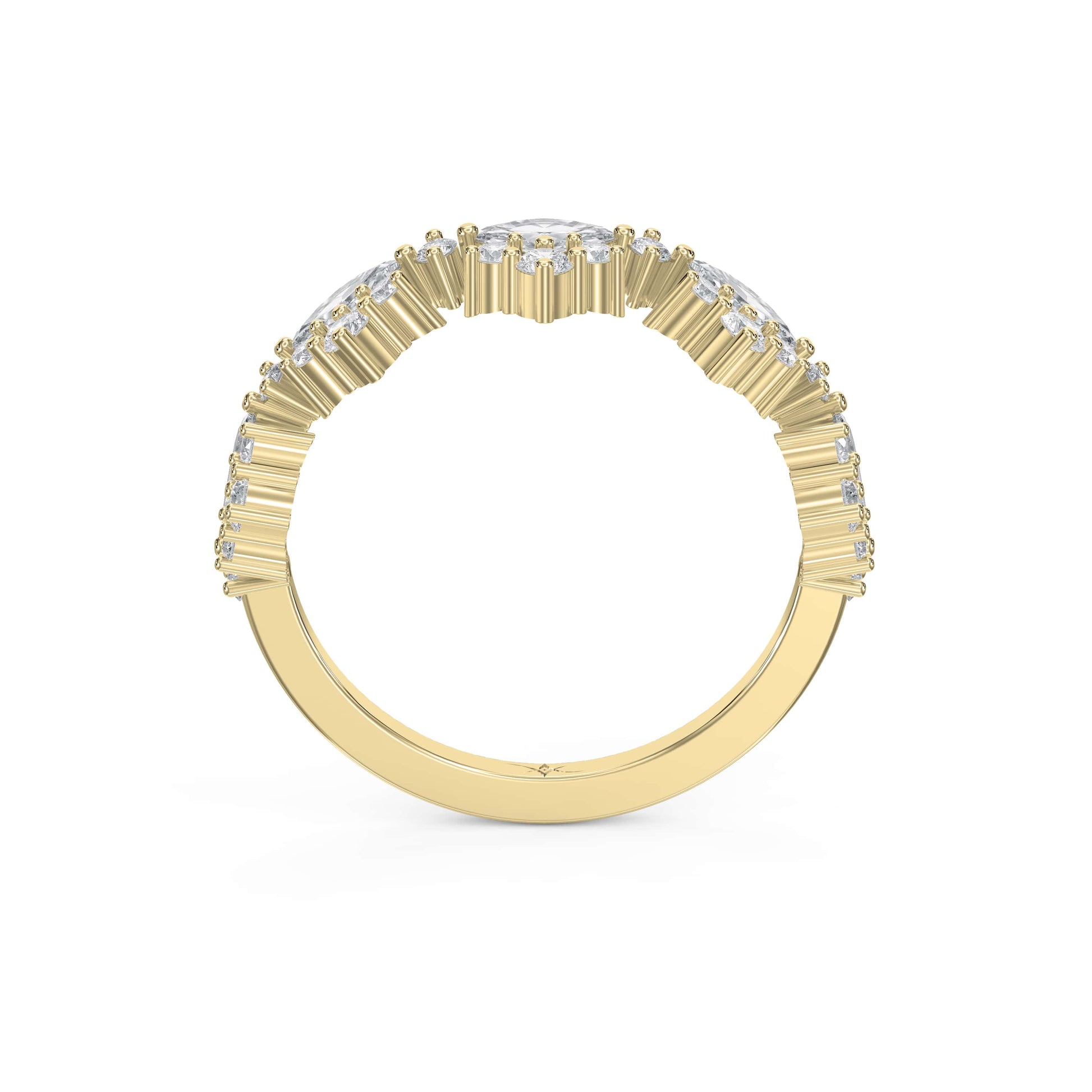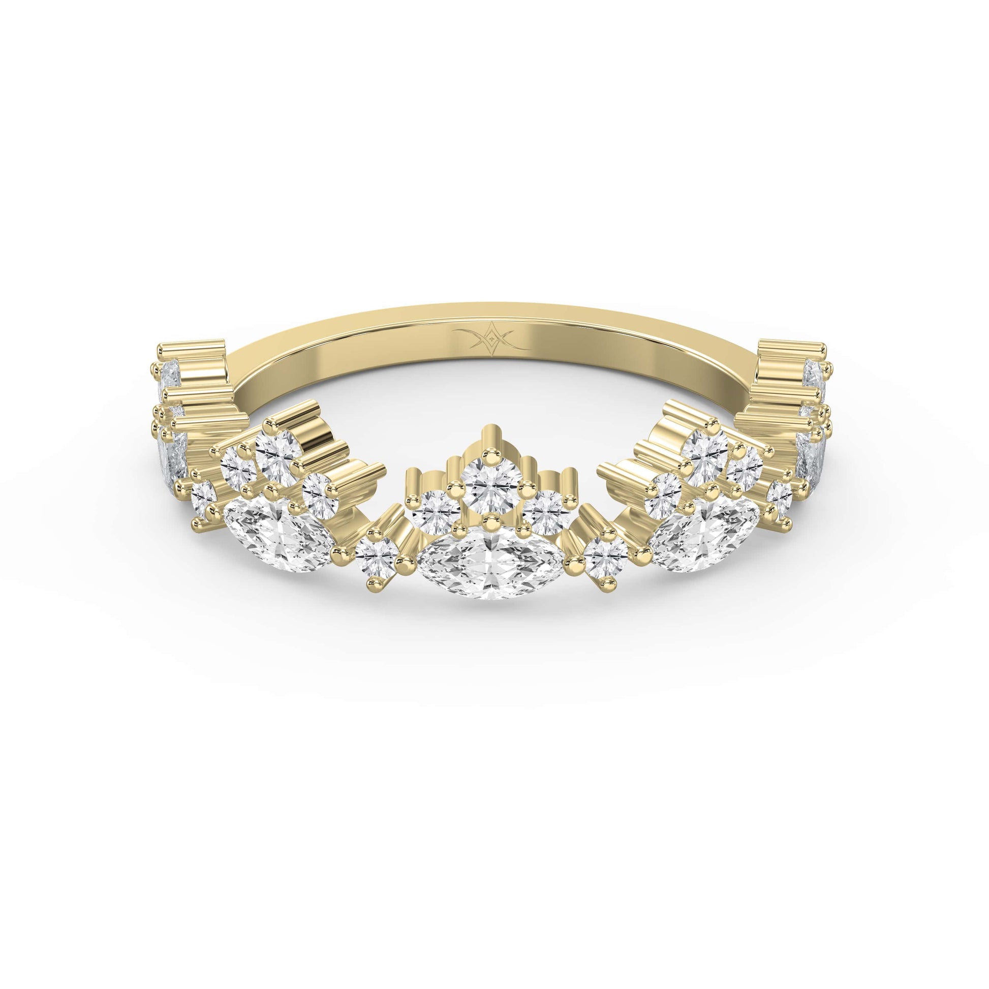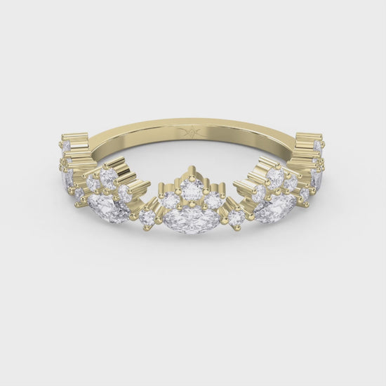 Alternating marquise-cut and round brilliant diamonds create a rhythmic sparkle that wraps around the finger in perfect harmony. Each stone is hand-selected and set to maximize light reflection, ensuring that the ring dazzles from every angle. Ideal for weddings, anniversaries, or as a chic stackable piece, this band embodies timeless femininity with a modern edge.
