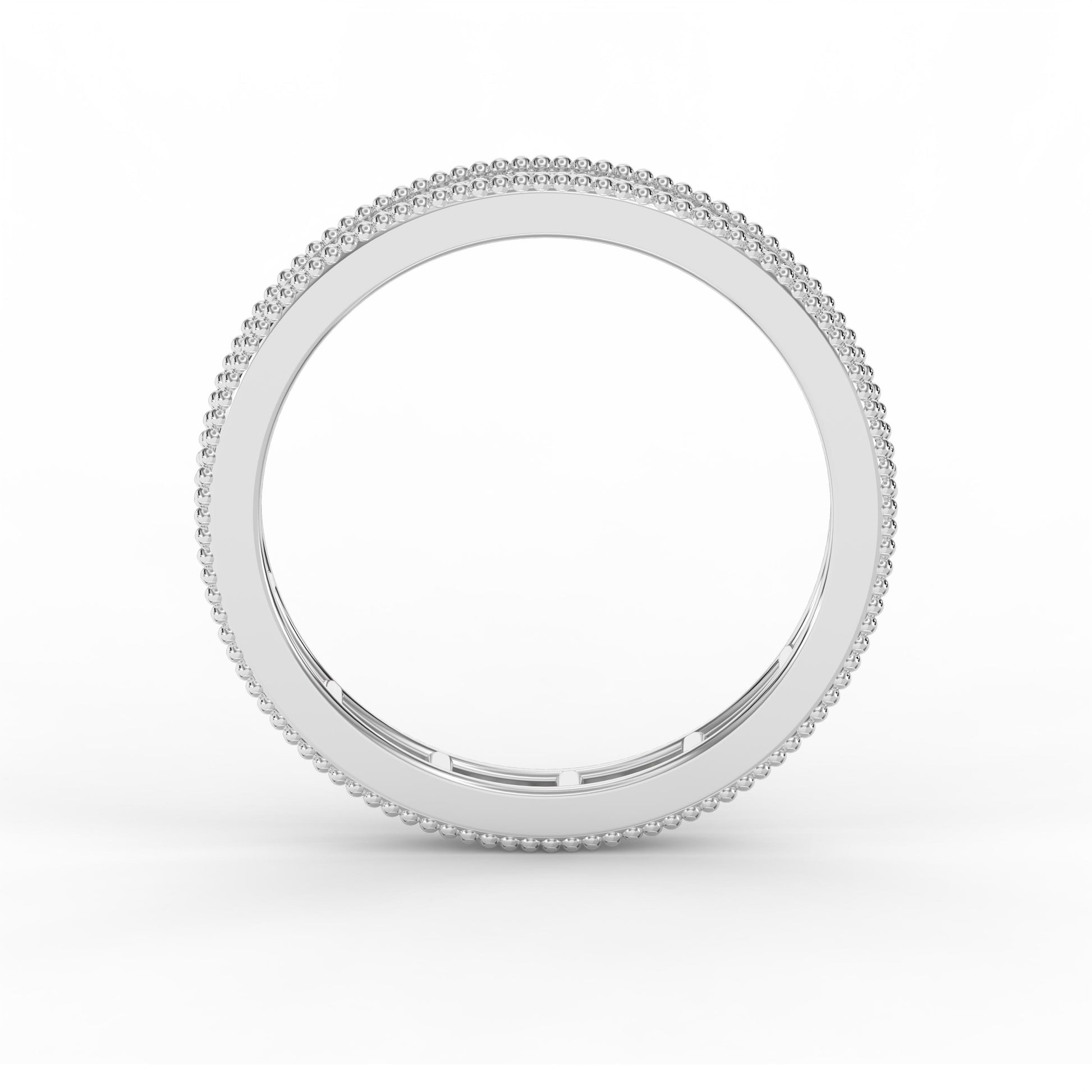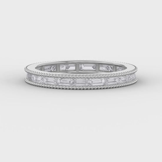 This elegant ring showcases alternating baguette-cut stones set with refined milgrain detailing along the band edges. The geometric precision of the baguette cuts creates a sophisticated linear aesthetic, while the milgrain work adds vintage-inspired craftsmanship and textural depth.