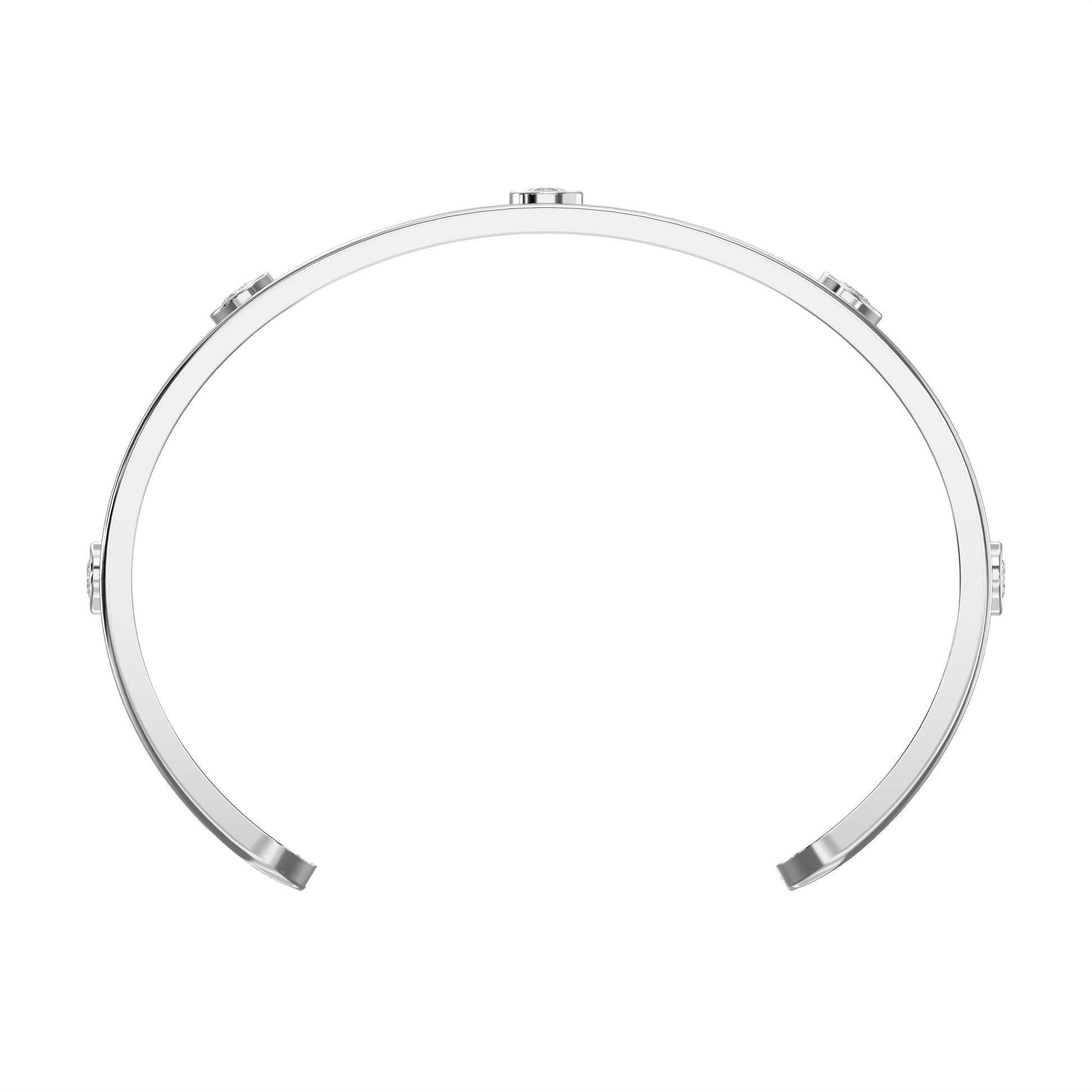 This bracelet features a polished open cuff design, highlighted by a series of brilliant round diamonds set in elegant bezel settings. The bezel design not only provides a contemporary edge but also ensures extra protection and durability for the stones. With its open structure and smooth finish, this cuff offers comfort and versatility, making it a perfect accessory for daily wear or special occasions.