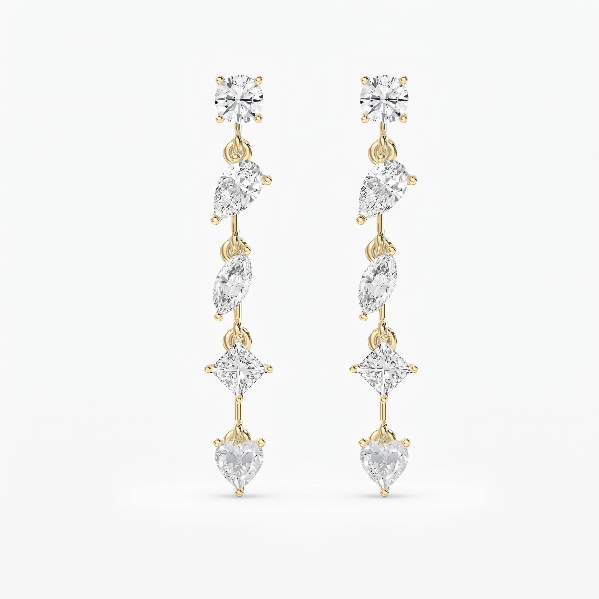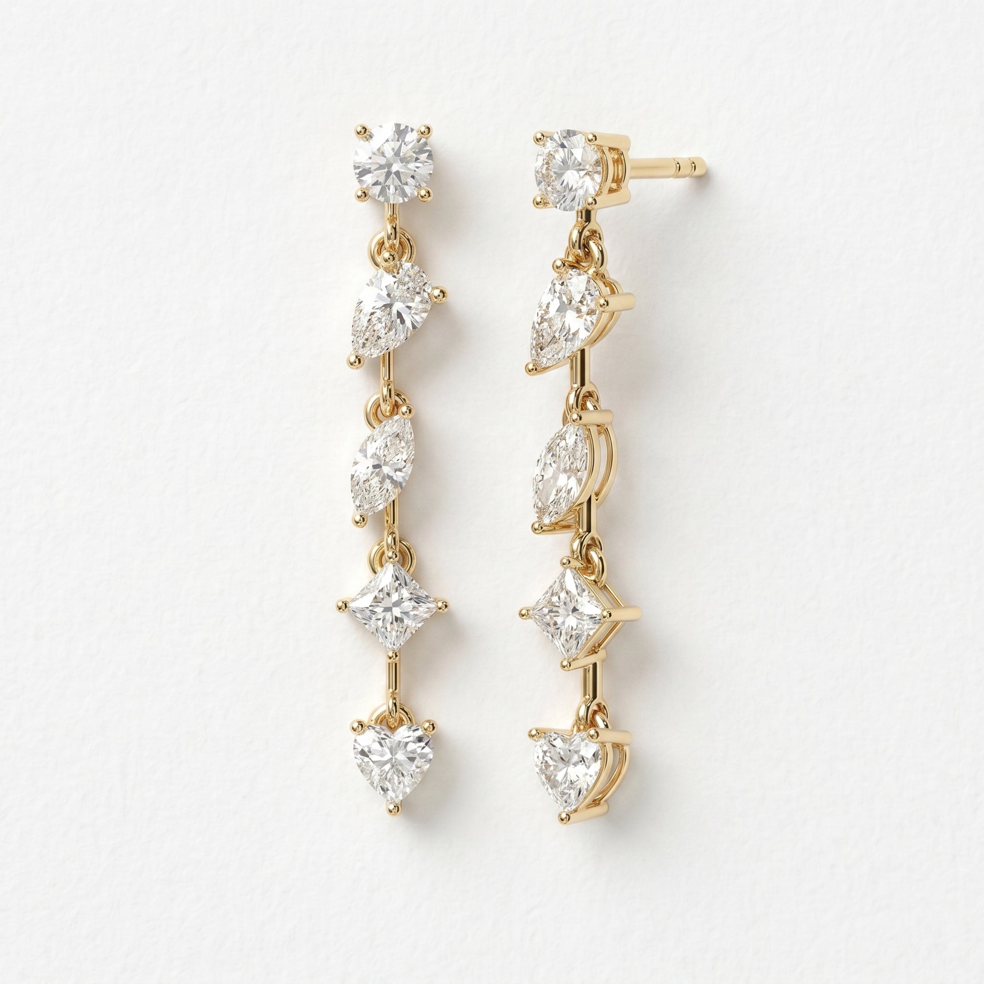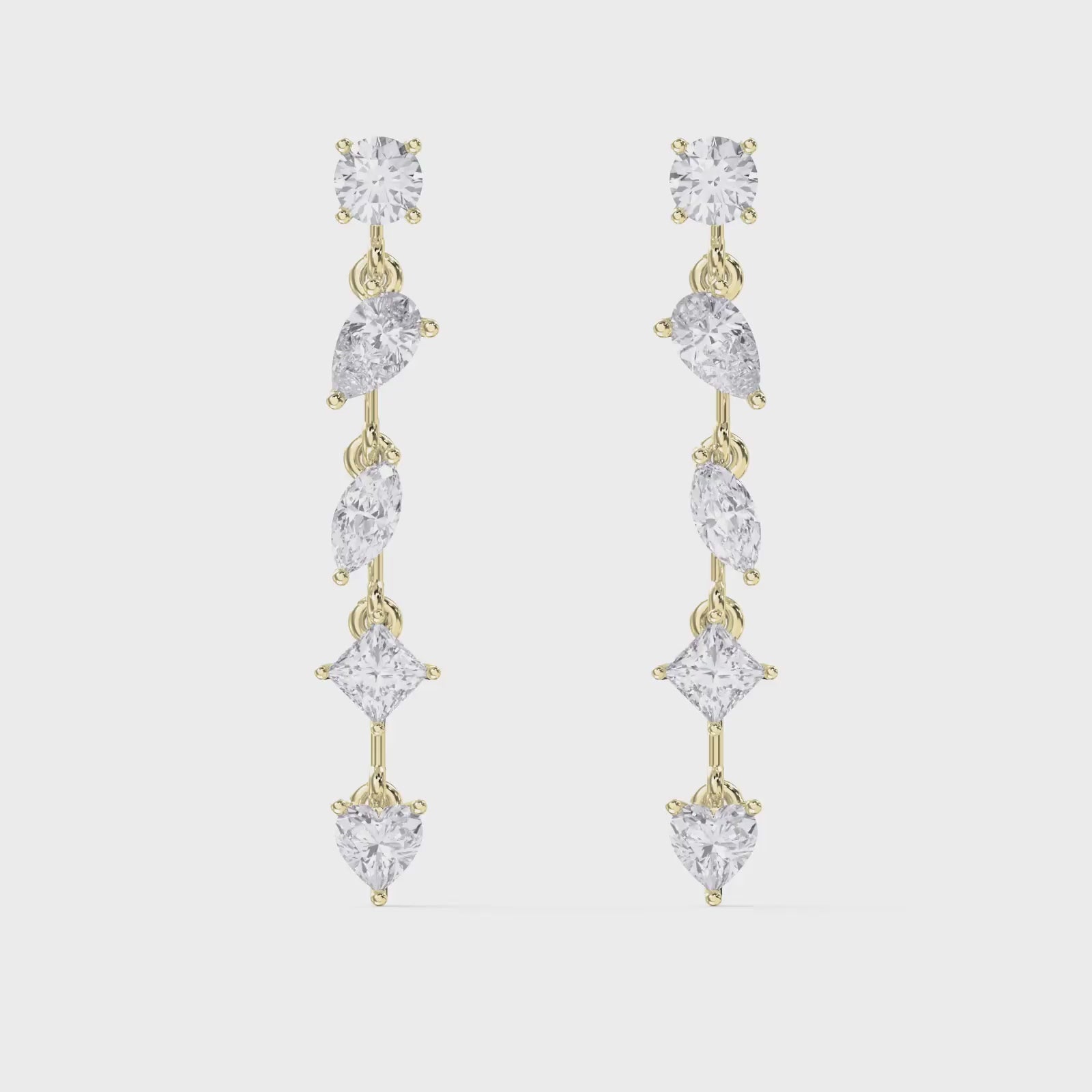 Add an artful sparkle to your jewelry collection with these stunning Drop and Dangle Earrings, featuring an enchanting medley of heart, round, pear, princess, and marquise-shaped diamonds. Designed to celebrate diversity in brilliance and form, each diamond shape adds a unique character and charm to the piece.