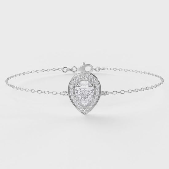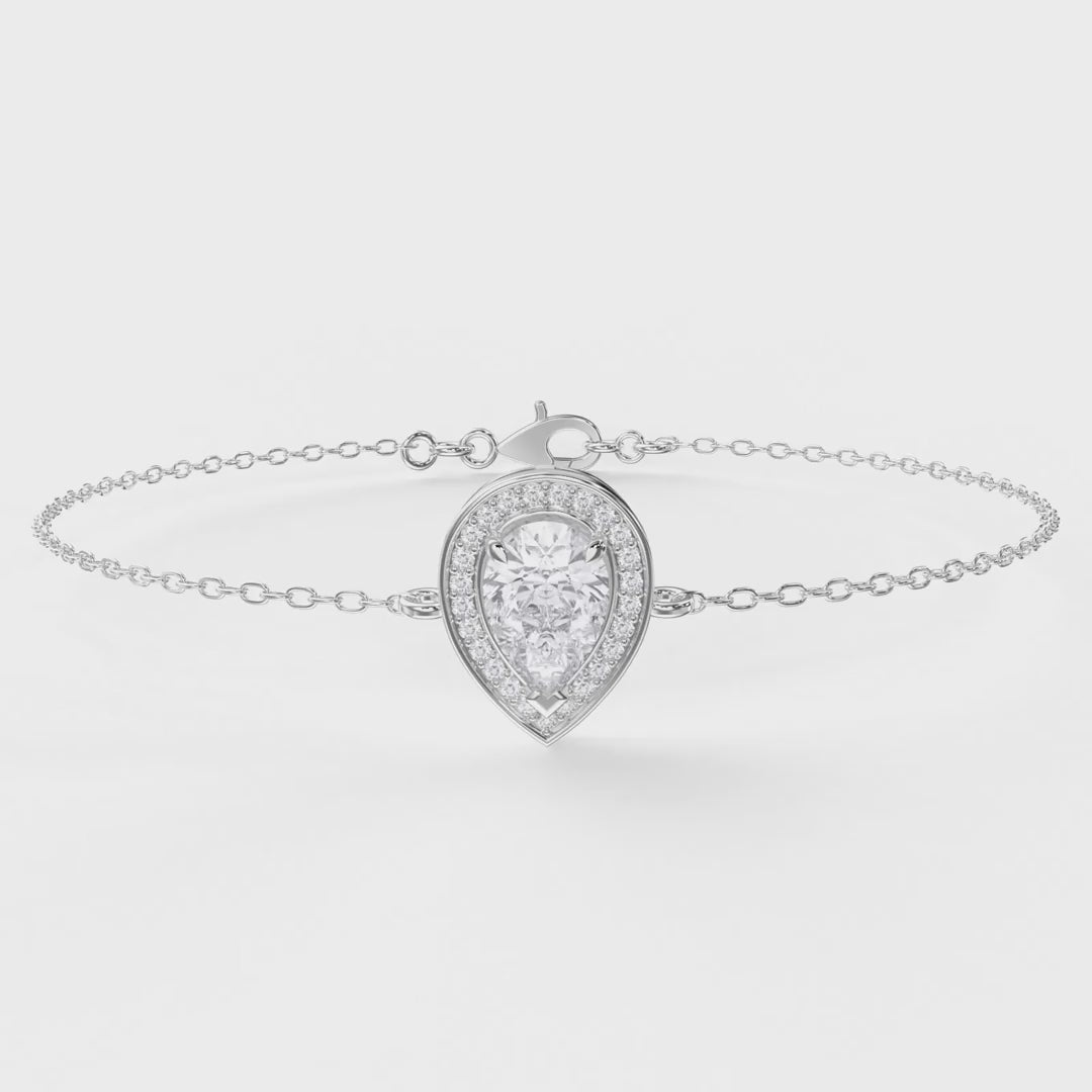 Available in yellow gold, white gold, rose gold, and platinum, this design can be customized with your choice of lab-grown diamonds. The halo design amplifies the brilliance of the pear-shaped center stone, while the sleek chain ensures comfort and durability. A modern yet classic piece, this bracelet is designed to be cherished for a lifetime.
