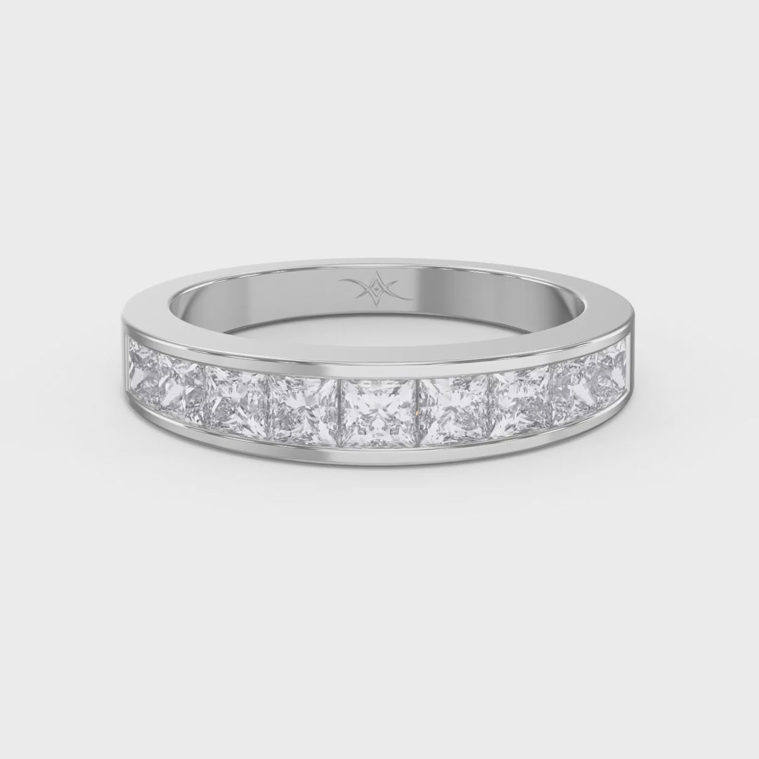 The princess cut diamonds are known for their sharp edges and exceptional brilliance, creating a continuous line of sparkle across the band. The channel setting not only enhances durability but also offers a smooth, snag-free finish, making it ideal for everyday wear.