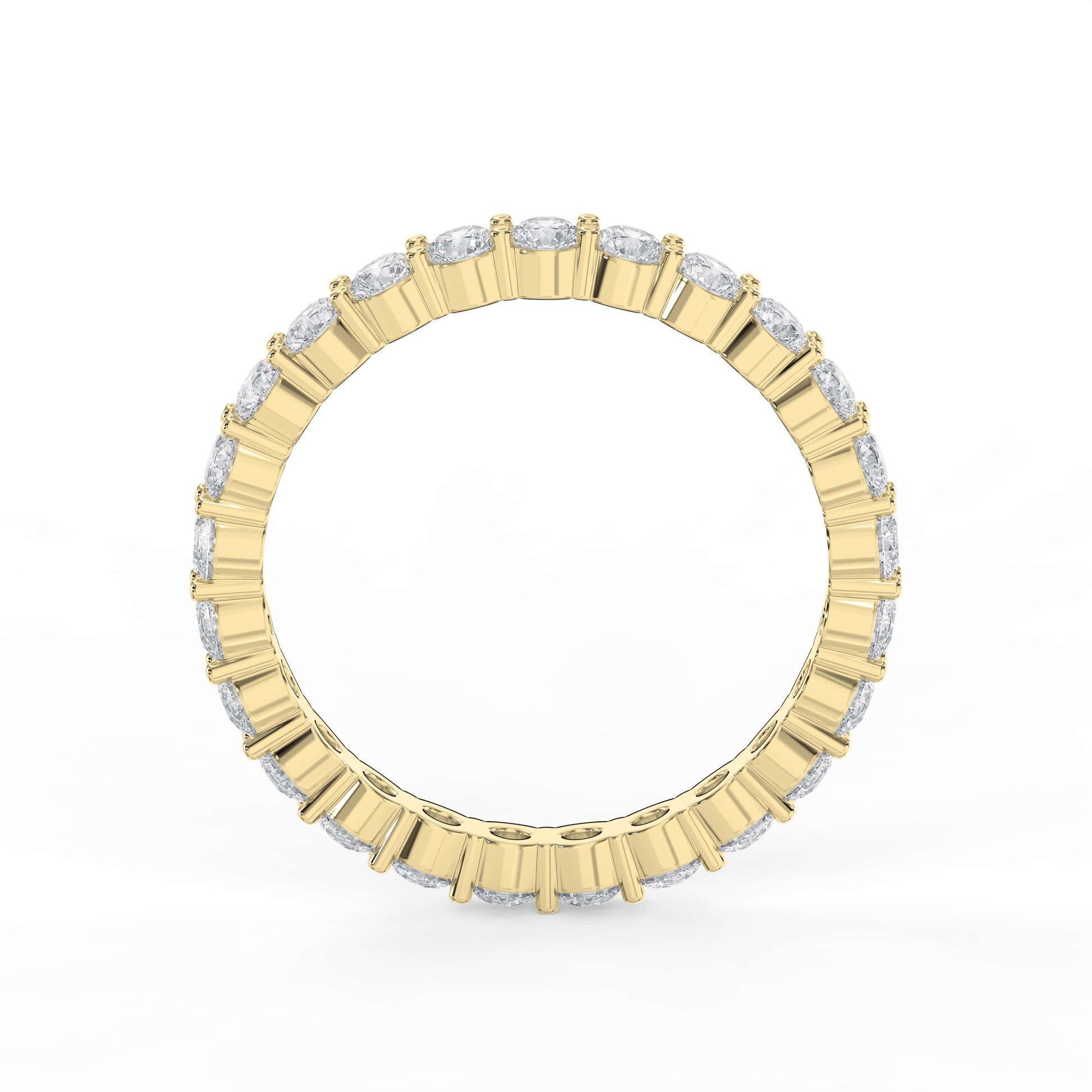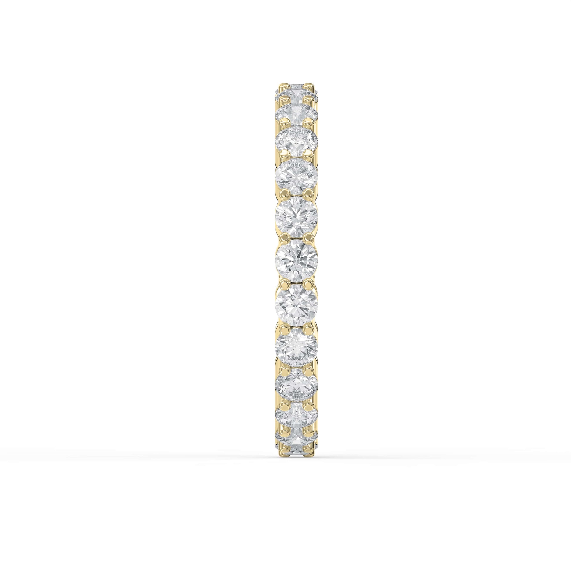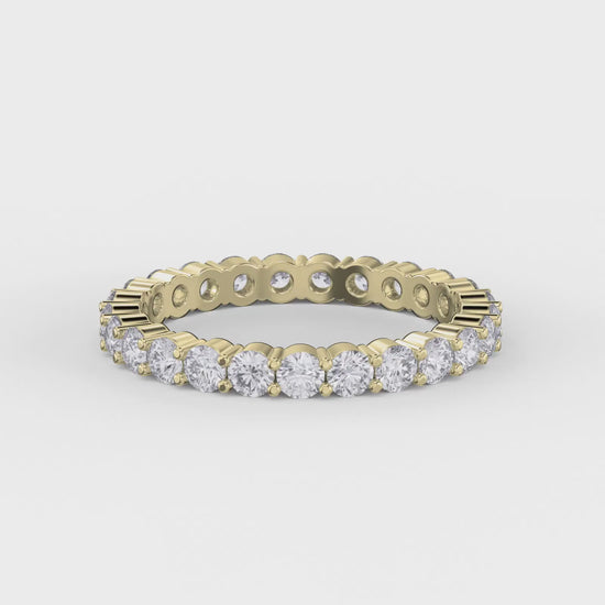This sleek and timeless design showcases a continuous circle of round brilliant-cut diamonds, each expertly prong-set to highlight maximum fire and sparkle. Whether worn as a standalone statement, a wedding band, or paired with your engagement ring, this piece offers a seamless fusion of sophistication and shimmer.