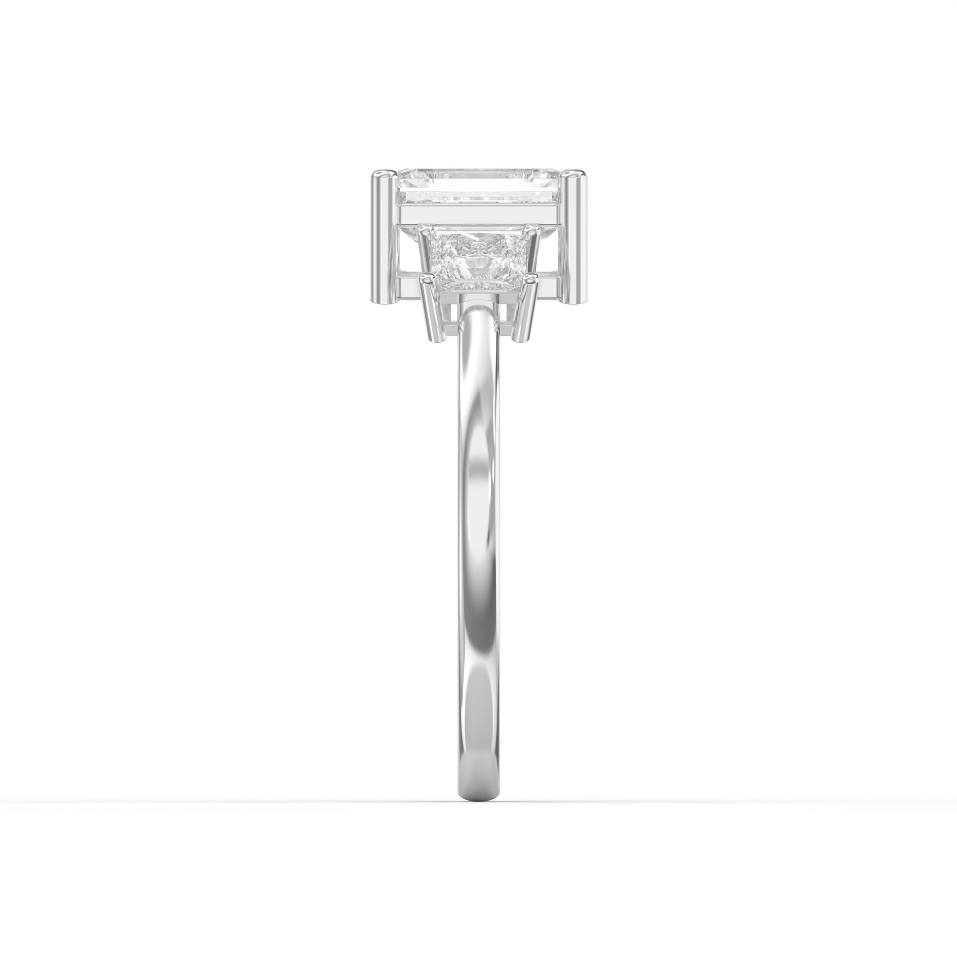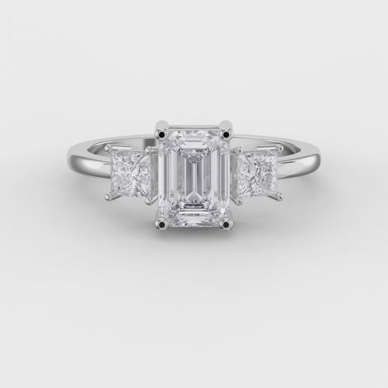 The Axis Trio Emerald Ring showcases a striking emerald centerpiece complemented by a sophisticated three-stone design that balances elegance with contemporary flair.