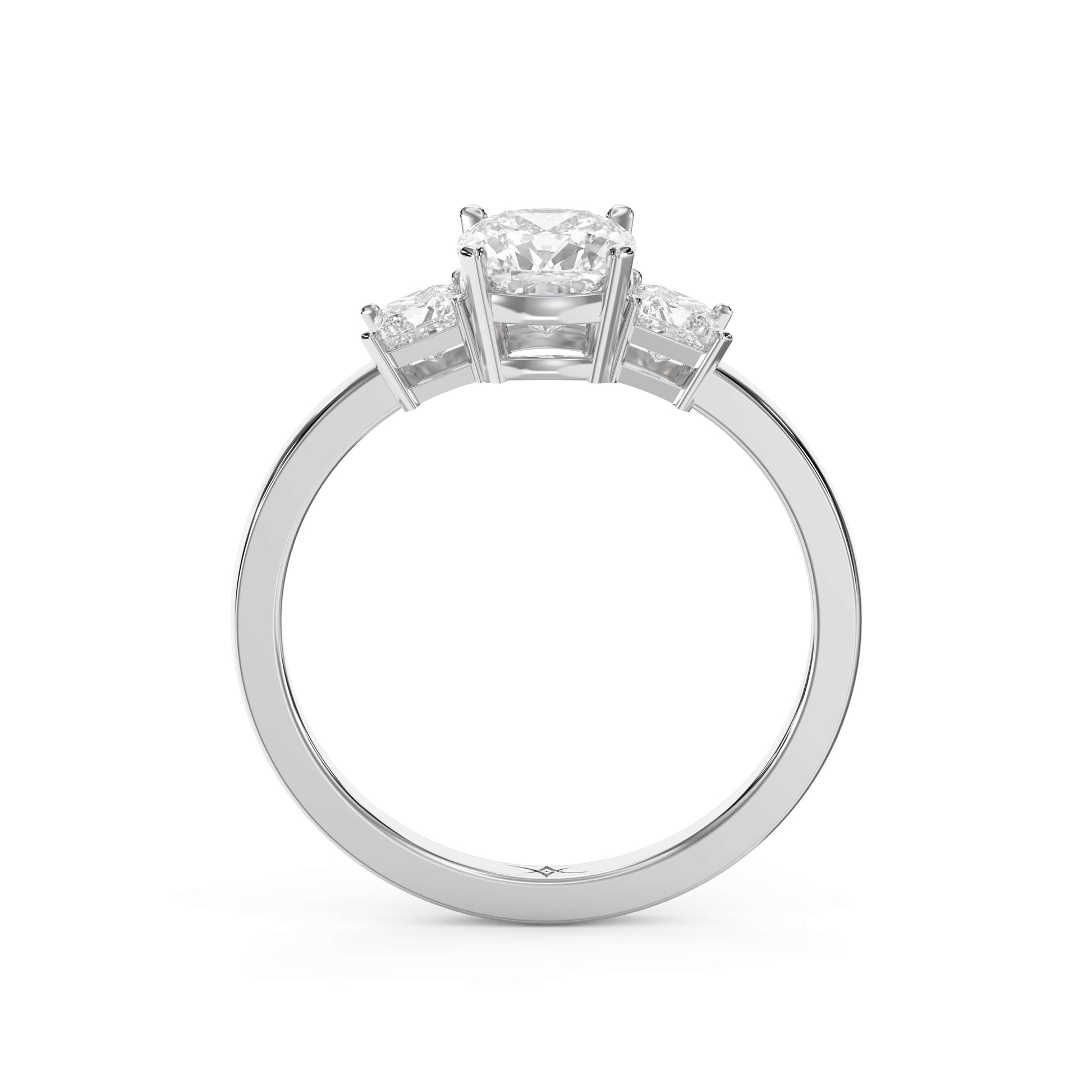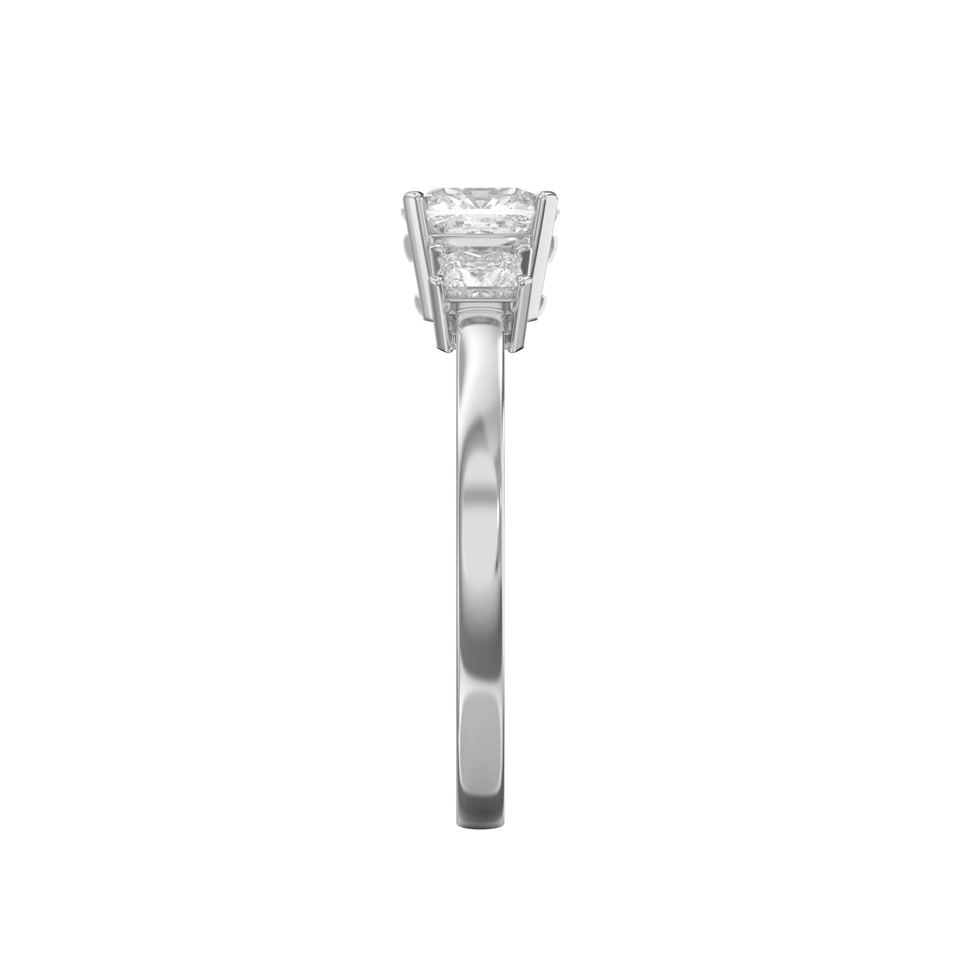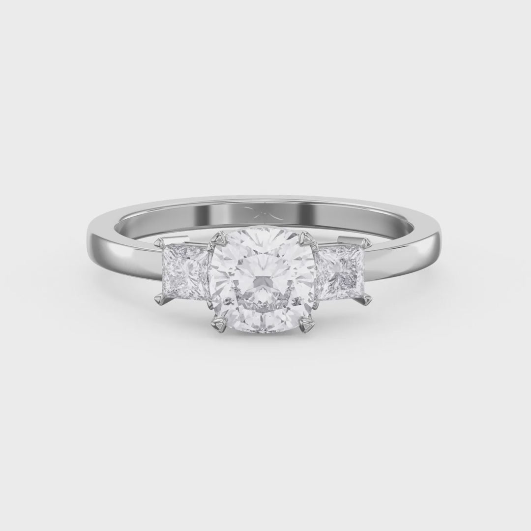 The Ever crest Cushion Trilogy represents sophisticated elegance through its distinctive three-stone design, each cushion-cut stone carefully selected for brilliance and clarity.