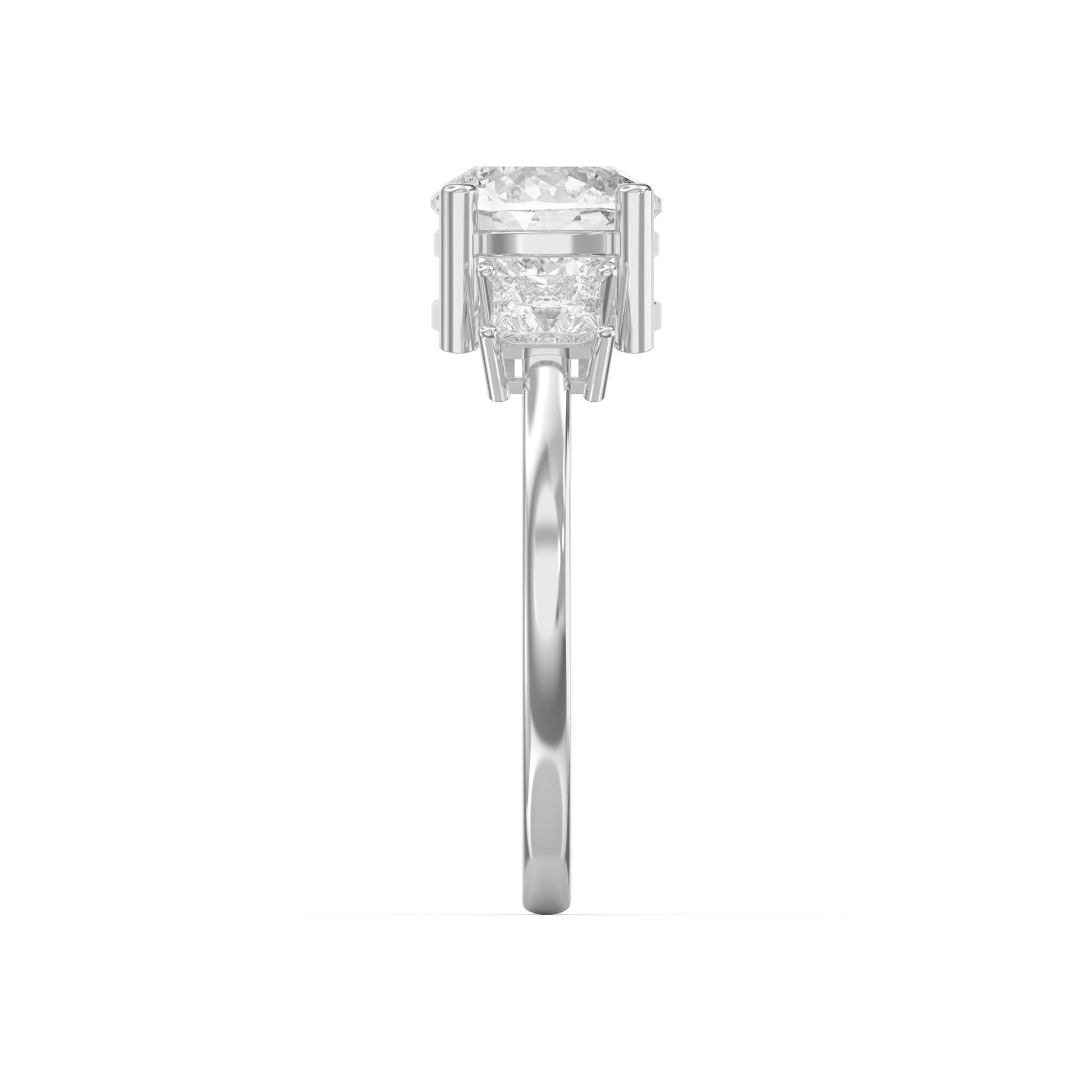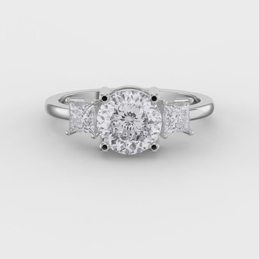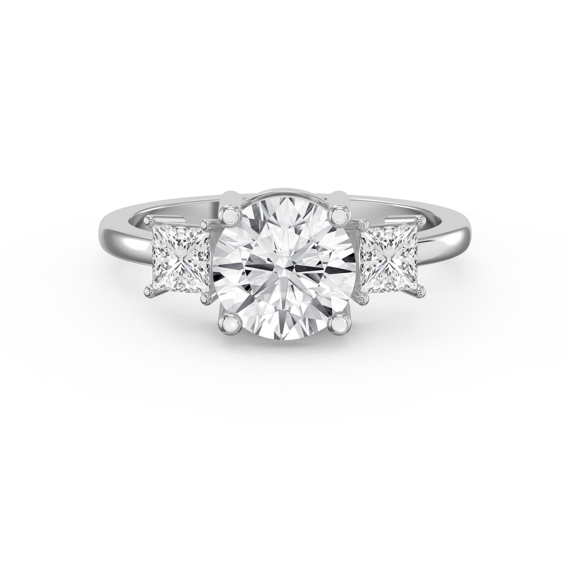 The Legacy Three-Stone Round captures timeless elegance through its sophisticated three-stone design, featuring a luminous round center stone flanked by complementary side stones.