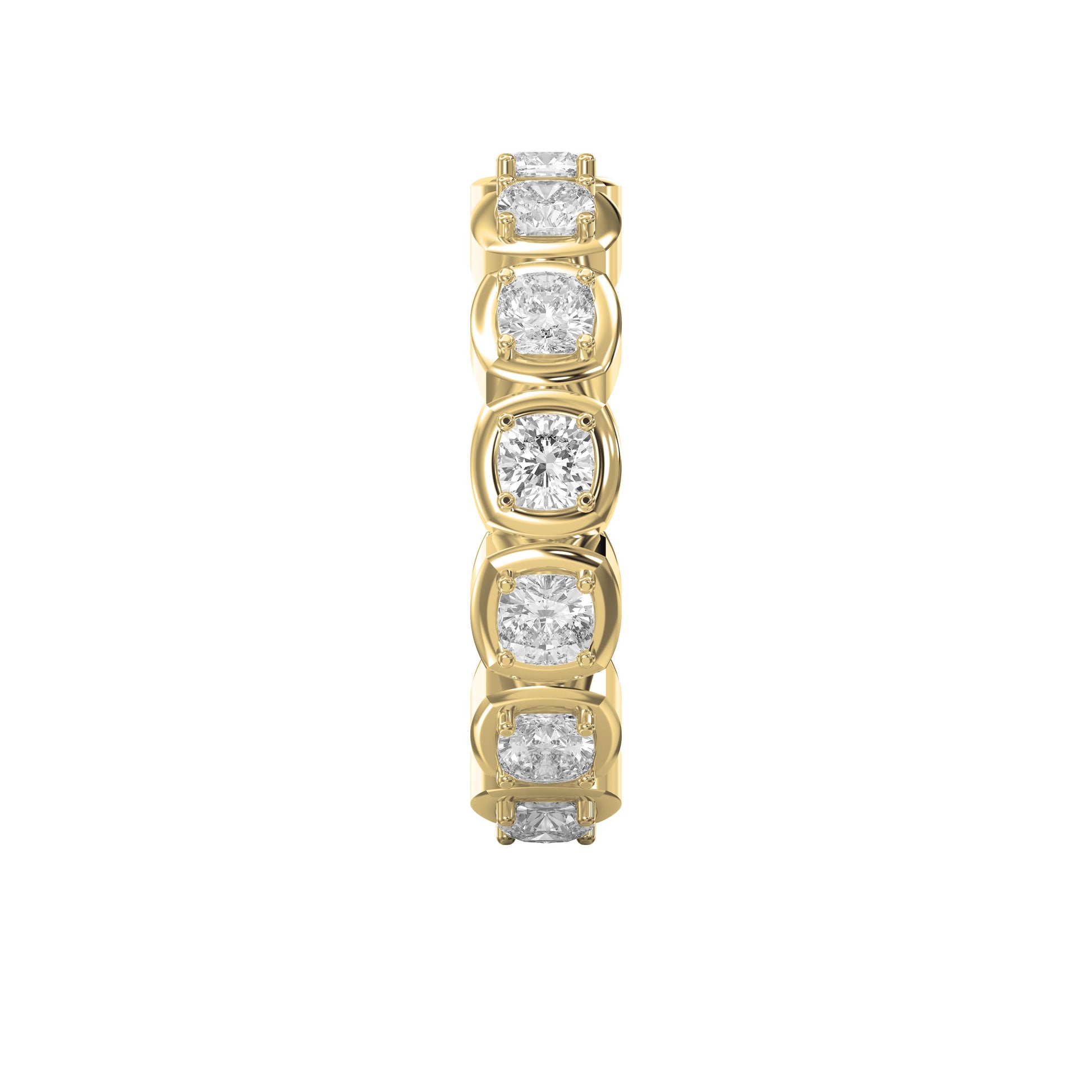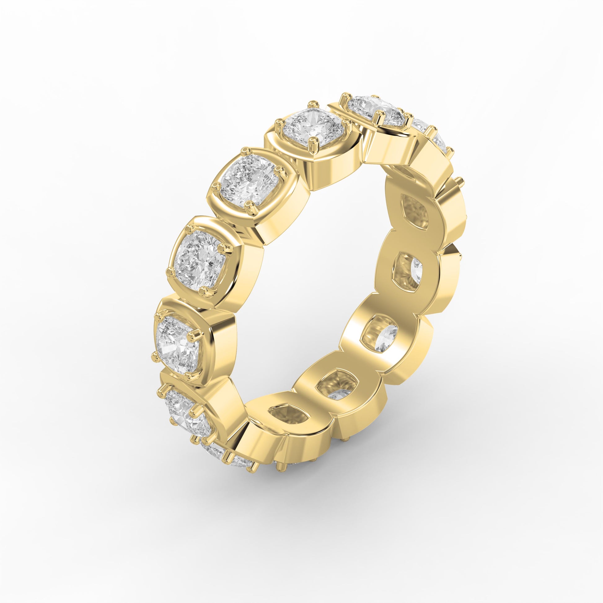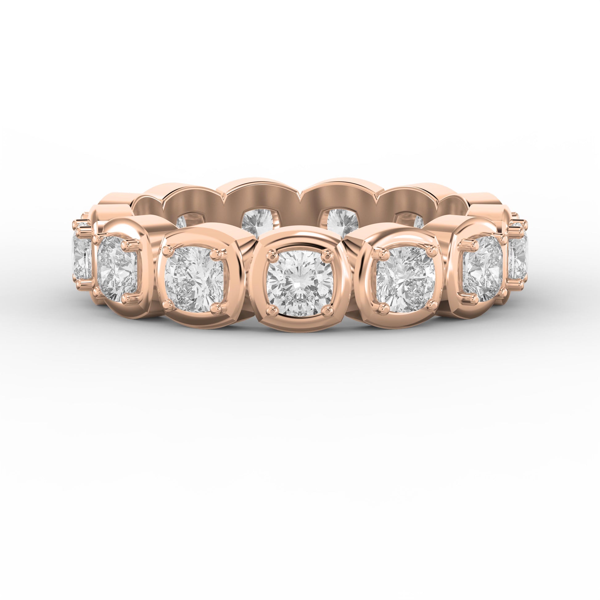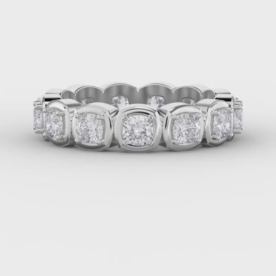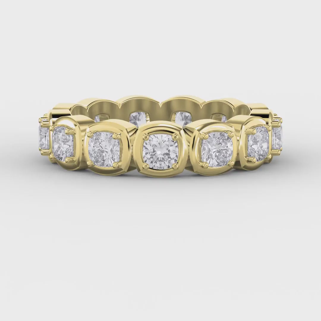 The unique cushion cut diamonds offer a soft, romantic sparkle, blending vintage charm with contemporary sophistication. The full eternity design ensures brilliance from every angle, making it an ideal choice for weddings, anniversaries, or a meaningful gift for someone special.