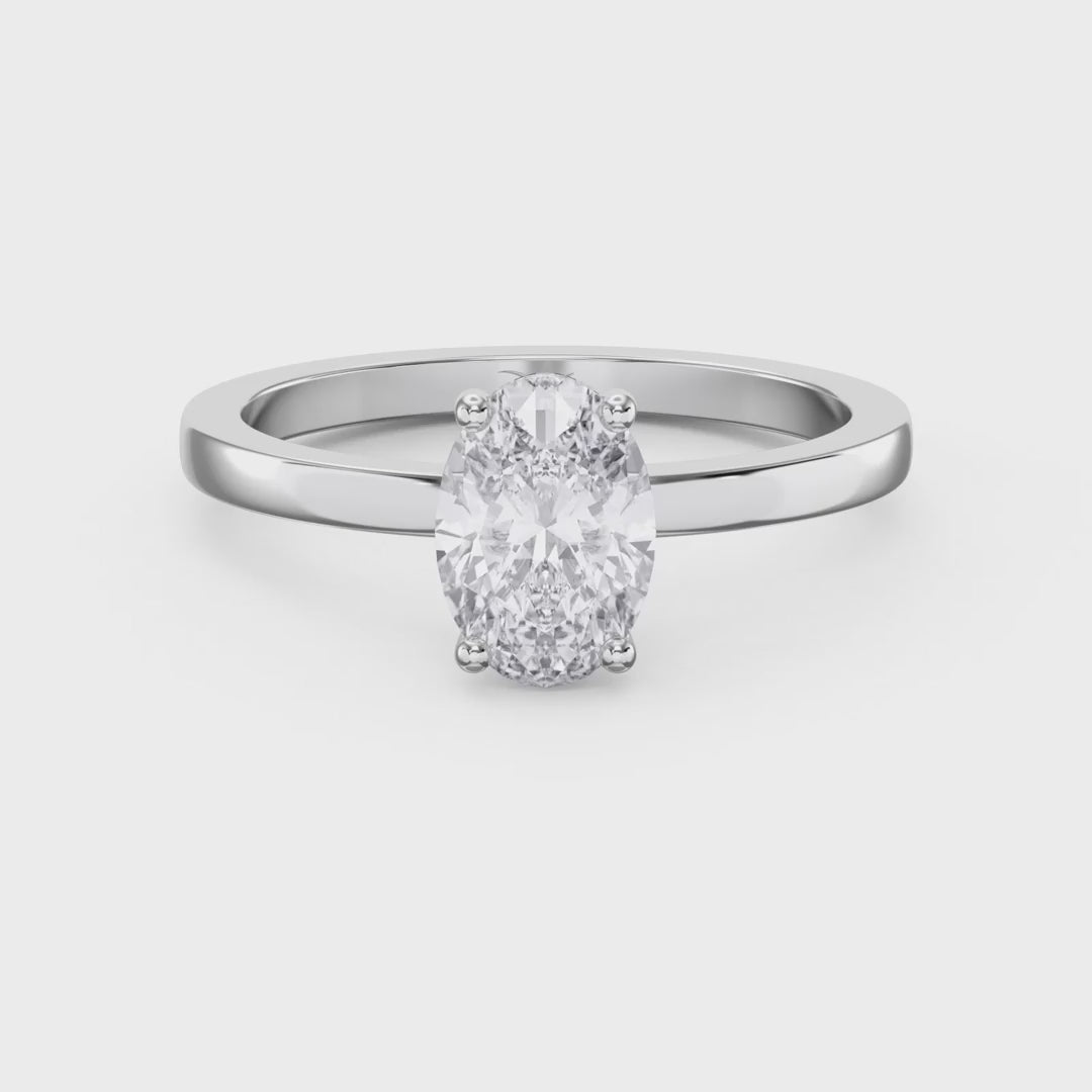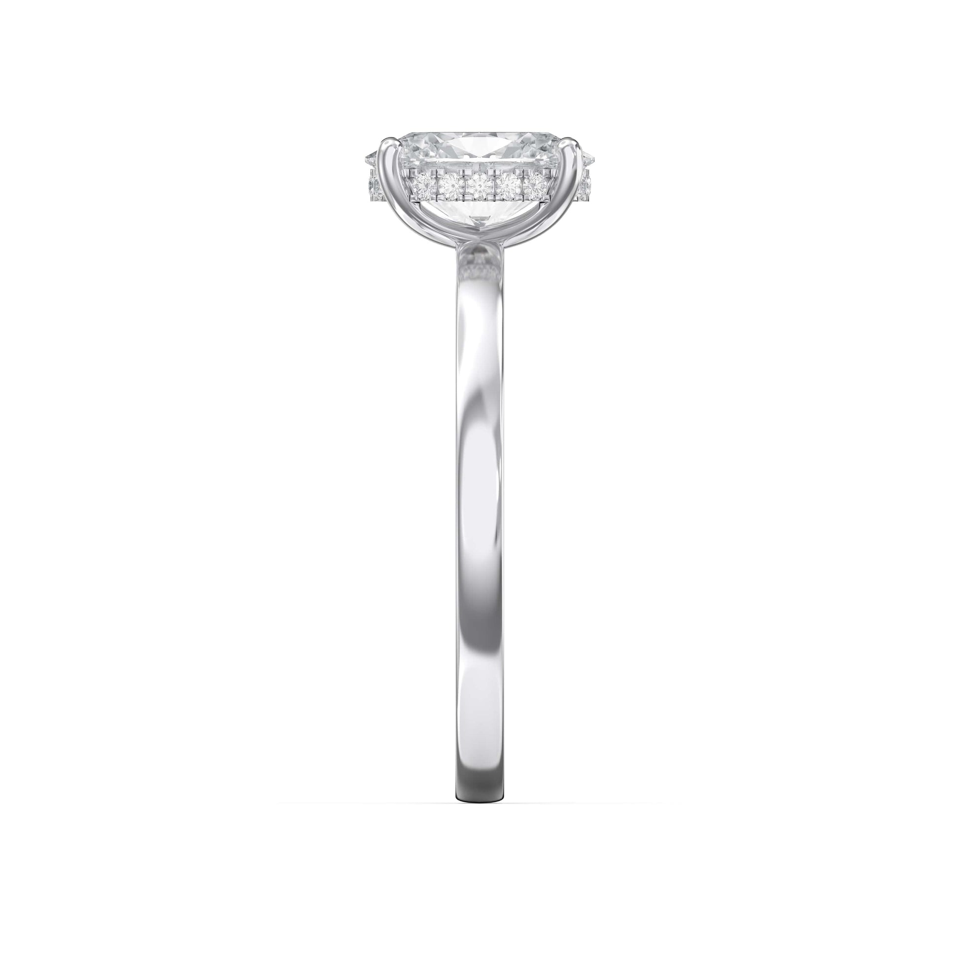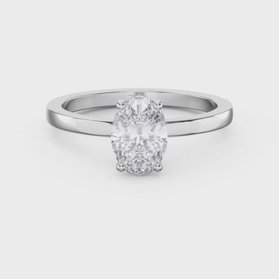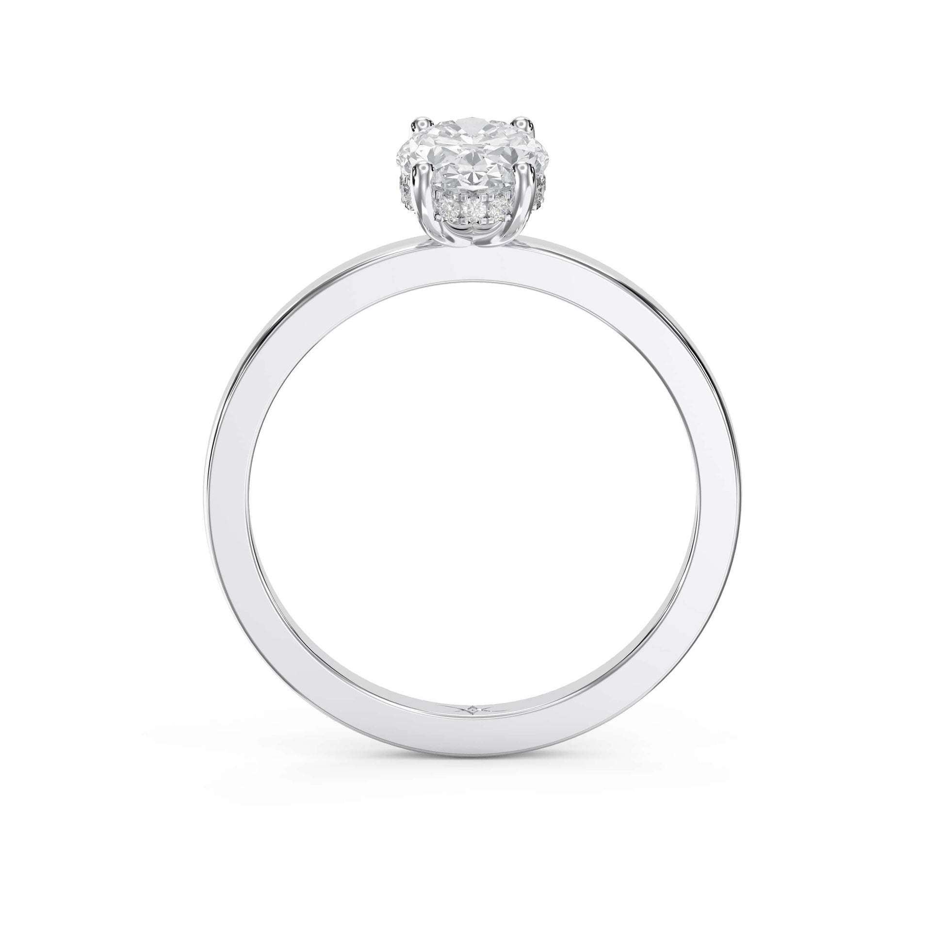The hidden halo setting offers a contemporary alternative to traditional designs, providing enhanced sparkle without compromising the clean lines of the oval stone.